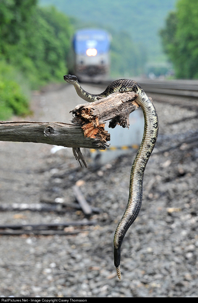 Trains aren't the only thing snaking their way through the mountains near Altoona: Timber rattlesnakes are abundant in the hills! This slithery example had 8 buttons on its tail, posing on an old log as the westbound Amtrak Pennsylvanian starts into Horseshoe Curve on main #3.