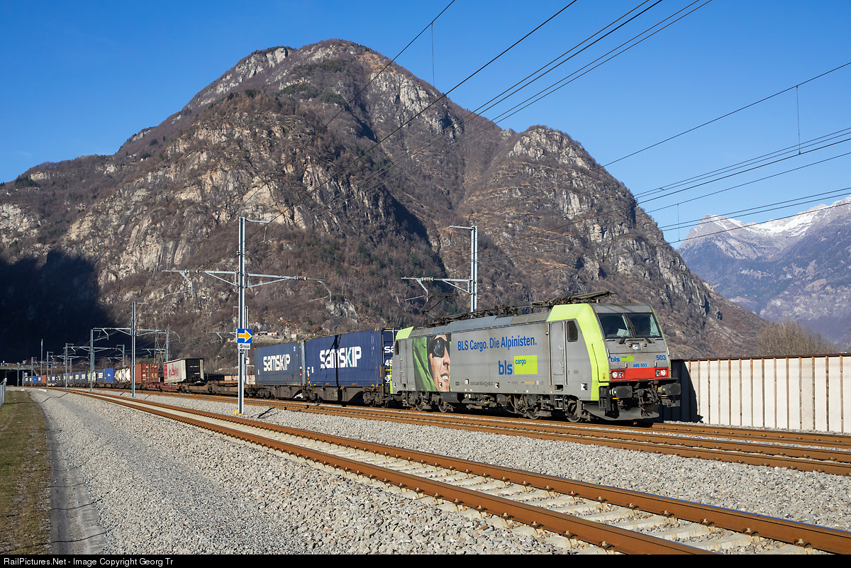 | Southbound freight 41027 of the BLS Cargo from Krefeld Uerdingen to Melzo Scalo, running on the new Gotthard Base Tunnel line which bypasses Biasca, between Pollegio and Giustizia. |