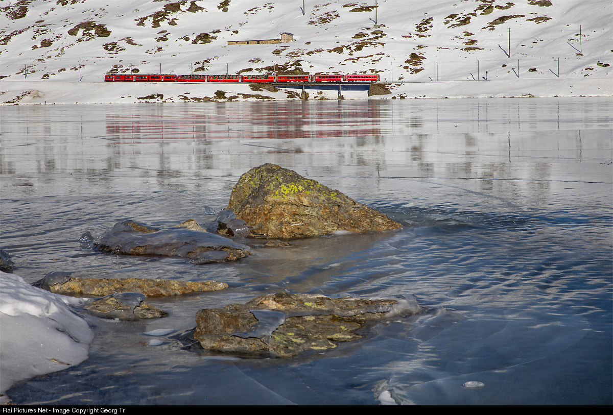 "Allegra" ABe 8/12 # 35.. with regional train 1644 from Tirano to St.Moritz is running along the frozen Lago Bianco.