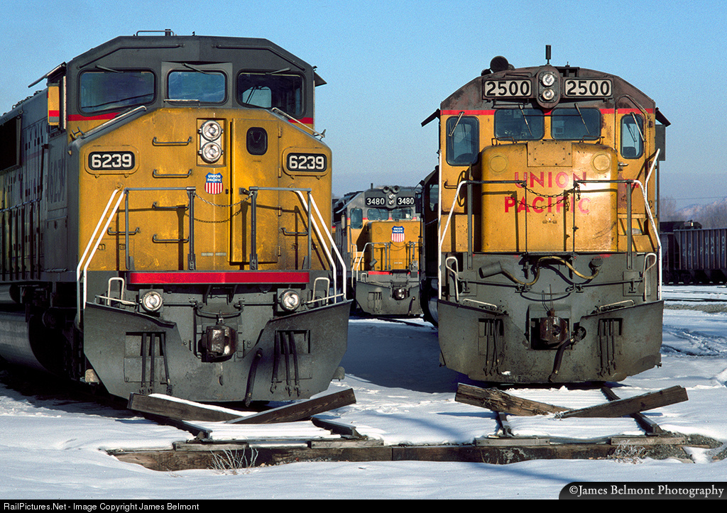 Union Pacific SD60M No. 6239, SD40-2 No. 3480, and C30-7 No. 2500 mingle at Provo Yard on Dec. 26, 1992. See if you can spot the surprise Rio Grande freight train that 'photobombed' the shot.
