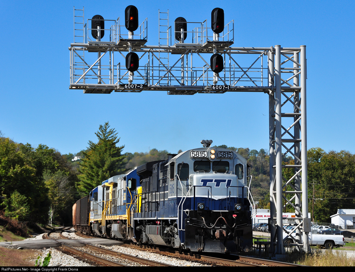 | With their delivery of coal to the TTI port terminal complete, three TTI B36-7 units now find themselves pushing empty rock hoppers under a signal on the CSX #1 track and back to the connection point with their mainline. From there, they'll head down to Paris and finish up what has been a very long day in the Bluegrass State. |