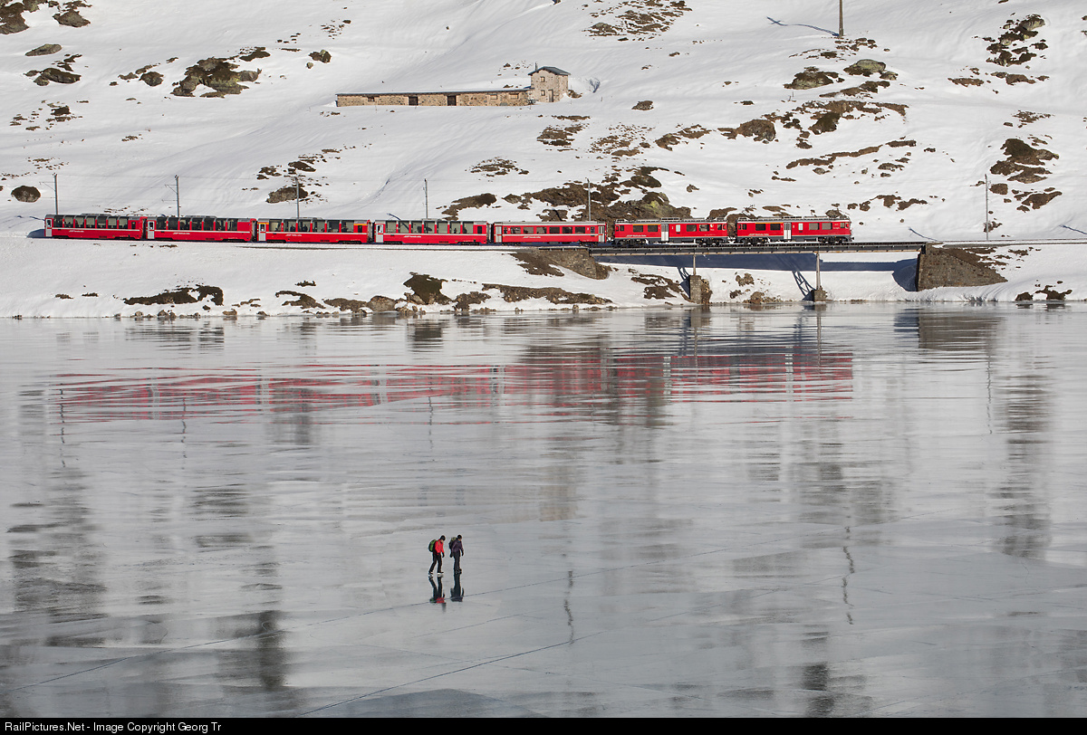 | Ice skaters on the frozen Lago Bianco on about 2230 meter a.s.l., while train R 1625 of the RhB from St.Moritz to Tirano is running towards Alp Grüm, pulled by electric railcars ABe 4/4 # 56 "Corviglia" and # 53 "Tirano". |