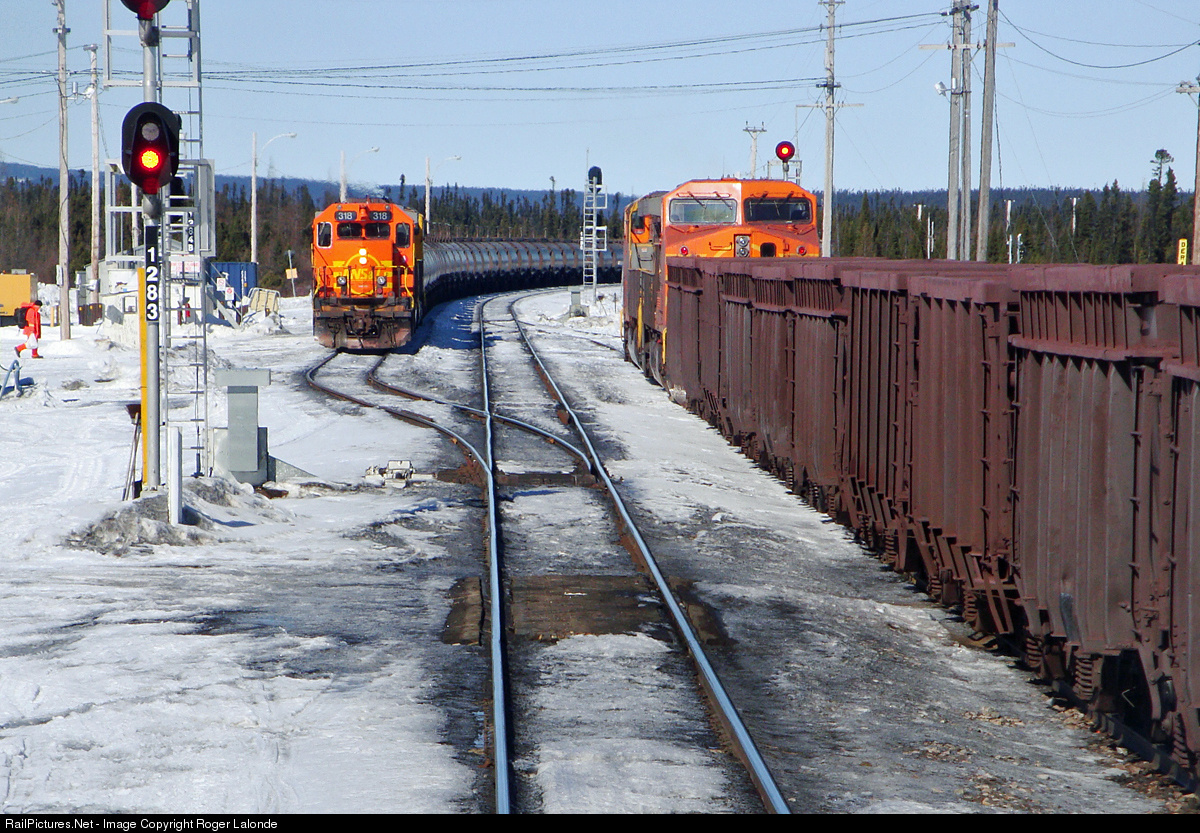 Southbound QNS&L SD40-2CLC 318 and AC4400CW 417 with Wabush Mine ore train, stopped for a crew change. On the other track, northbound QNS&L AC4400CW's 426 and 419 with empty IOC 252 train.