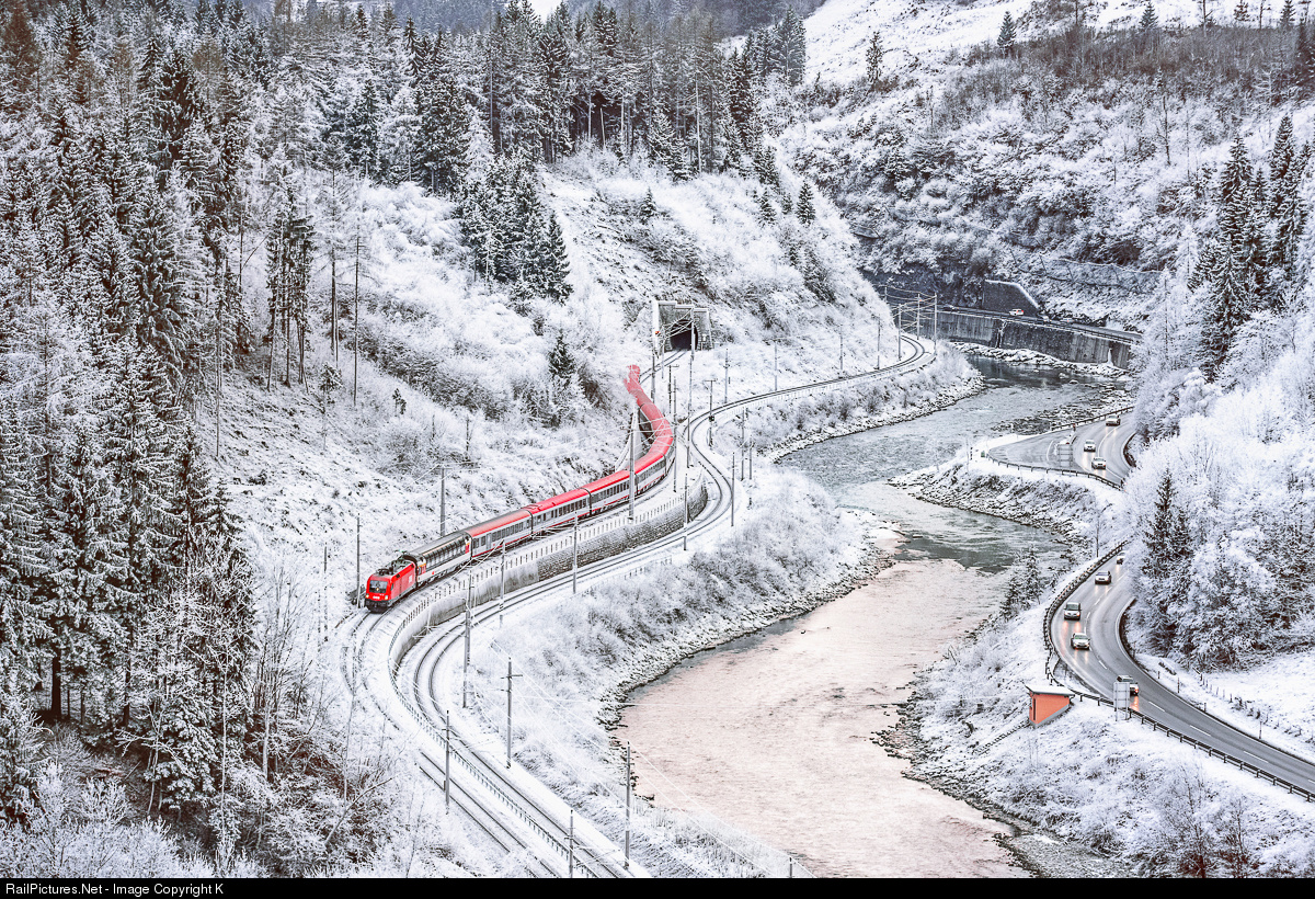 | Eurocity "Transalpin" arrives to Schwarzach im Pongau to meet the Northbound Tauern Railjet (started this day as timetables changed). After a 3 min stop it'll head East to Graz. I had luck with this walley (Schwarzah river), because the sun can't get in here from November till February so it is wet all winter, and freezes every night to become such a beautiful sight. |