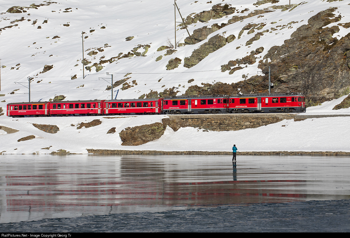 Electric railcars ABe 4/4 # 55 "Diavolezza" and # 54 "Hakone" are running along the frozen Lago Bianco on about 2230 meter a.s.l. with train R 1629 From St.Moritz to Tirano.