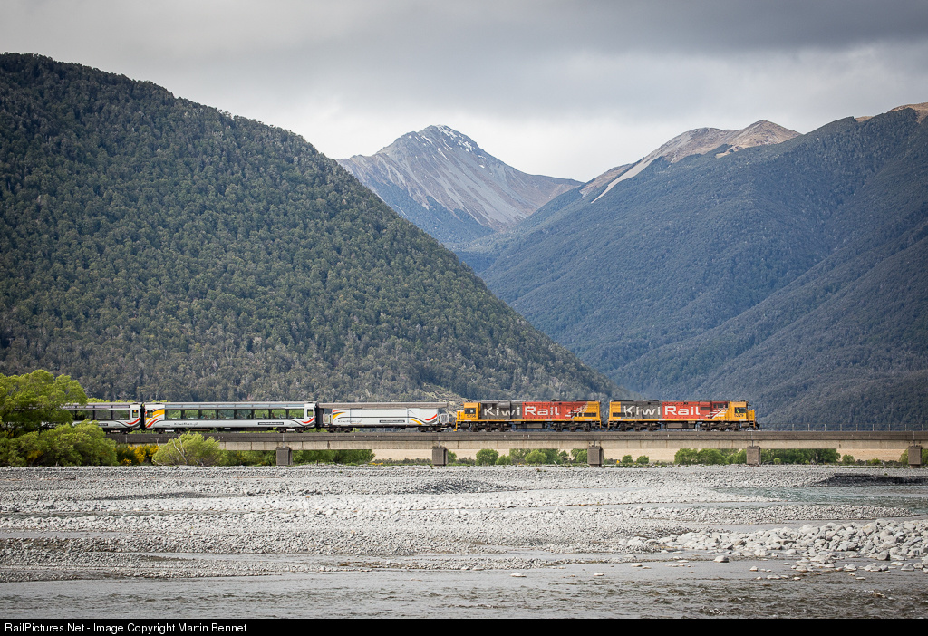 Trains on 3' 6" (1.067m) track from Whangarei to Bluff with virtually heritage rebuilt EMD and GE locomotives still the mainstay power. The network was privatized in 1990's and operated by Toll until 2008 when state owned KiwiRail was established.