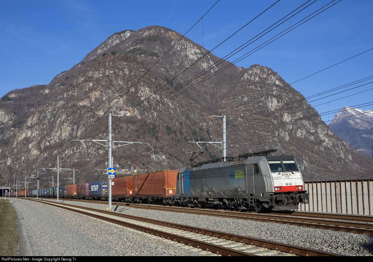 | Southbound container train 43003 of BLS Cargo from Rheinhausen/Germany to Pomezia San Palombo/Italy, with rented 186 # 104 of Railpool with BLS stickers, is running over the bypass of Biasca on the new Gotthard Base Tunnel line. |