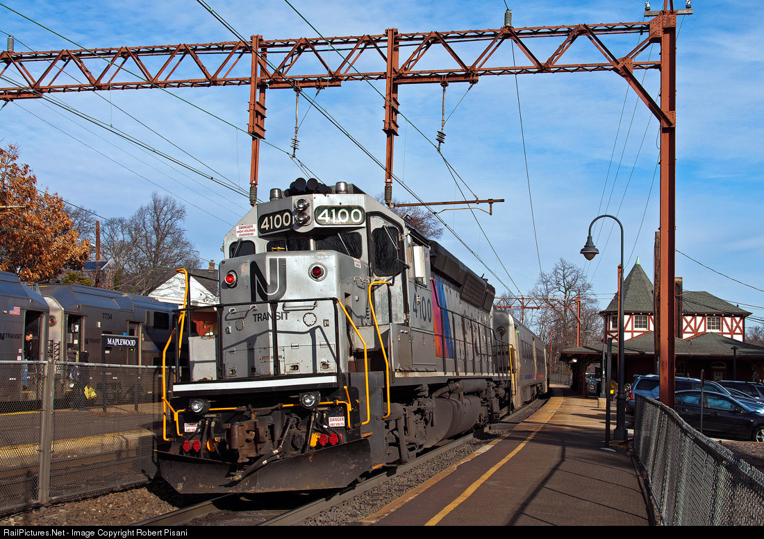 | A veteran with 48 years of service to New Jersey commuters shoves train 854 out of Maplewood on a brisk late fall afternoon. This train left Hackettstown at 11:55am and will arrive in Hoboken at 1:59pm if all goes well. NJTR 4100 was built in October 1968 as CNJ 3681 to handle their commuter services centered around Newark's Penn Station after the "Aldene Plan" was enacted. This unit would later become part of the NJ DOT fleet, where it was renumbered 4110. It retained this number under NJ Transit until an eventual rebuilding where it was renumbered as 4100. |