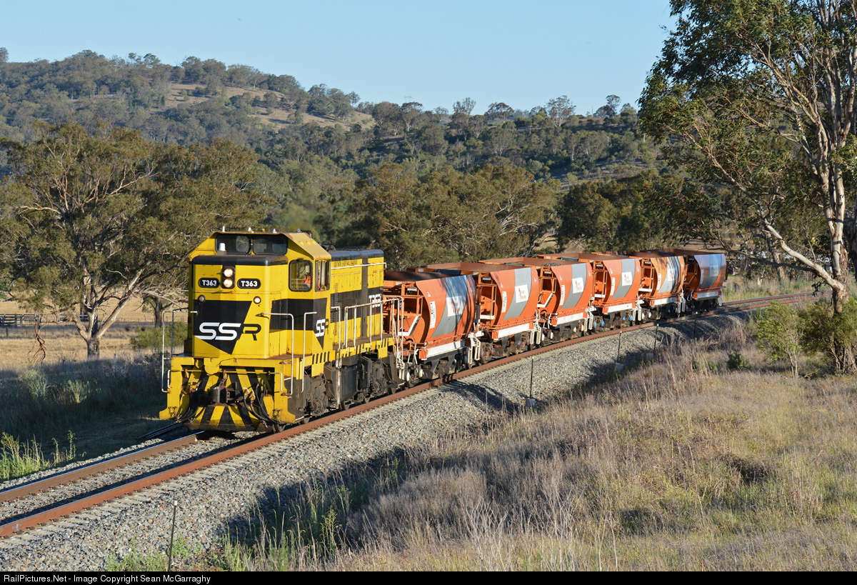 Southern Shorthaul Railroad's T363 is slugging away on a short Broadmeadow to Narrabri ballast train. This section near Blandford is the beginning of a steep climb up Adglen bank where the 950HP T class will surely be put hard to work.