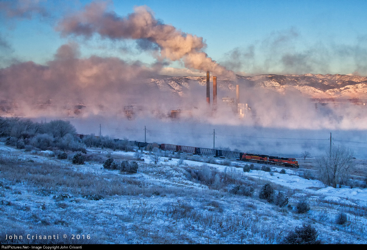 The temperature is around -10F as the sun begins to rise, starting another day along the Front Range as BNSF C44-9W No. 1011 leads the Cheyenne, Wyoming to Denver, Colorado manifest out of Boulder, Colorado on December 18, 2016. Xcel Energy's Valmont power plant is seen behind the train.