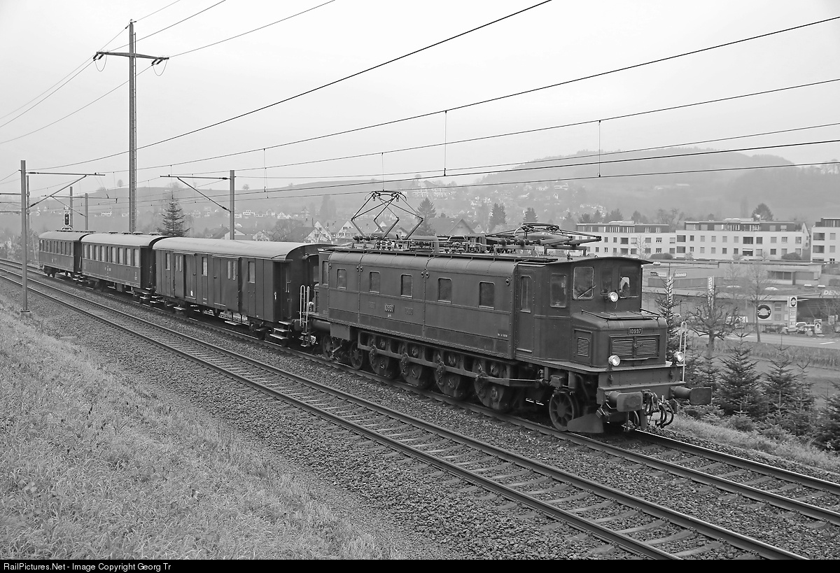| It's not a SBB passenger train from decades ago, but a transfer run of former SBB cars, now with association Vapeur Val-de-Travers (VVT), with locomotive Ae 4/7 # 10997 of association Swisstrain from Payerne. The cars were partly rebuilt in the last years in a factory in the Czech Republic. |