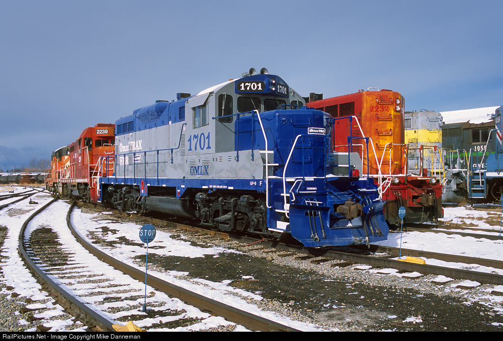 OmniTRAX EMD GP9 No. 1701 sits at the OMNX locomotive facility at Loveland, Colorado, on November 27, 2001. The locomotive is labeled a GP9, but is former C&NW GP7 No. 4434 and CR/PC/NYC No. 5701 built in 1952.