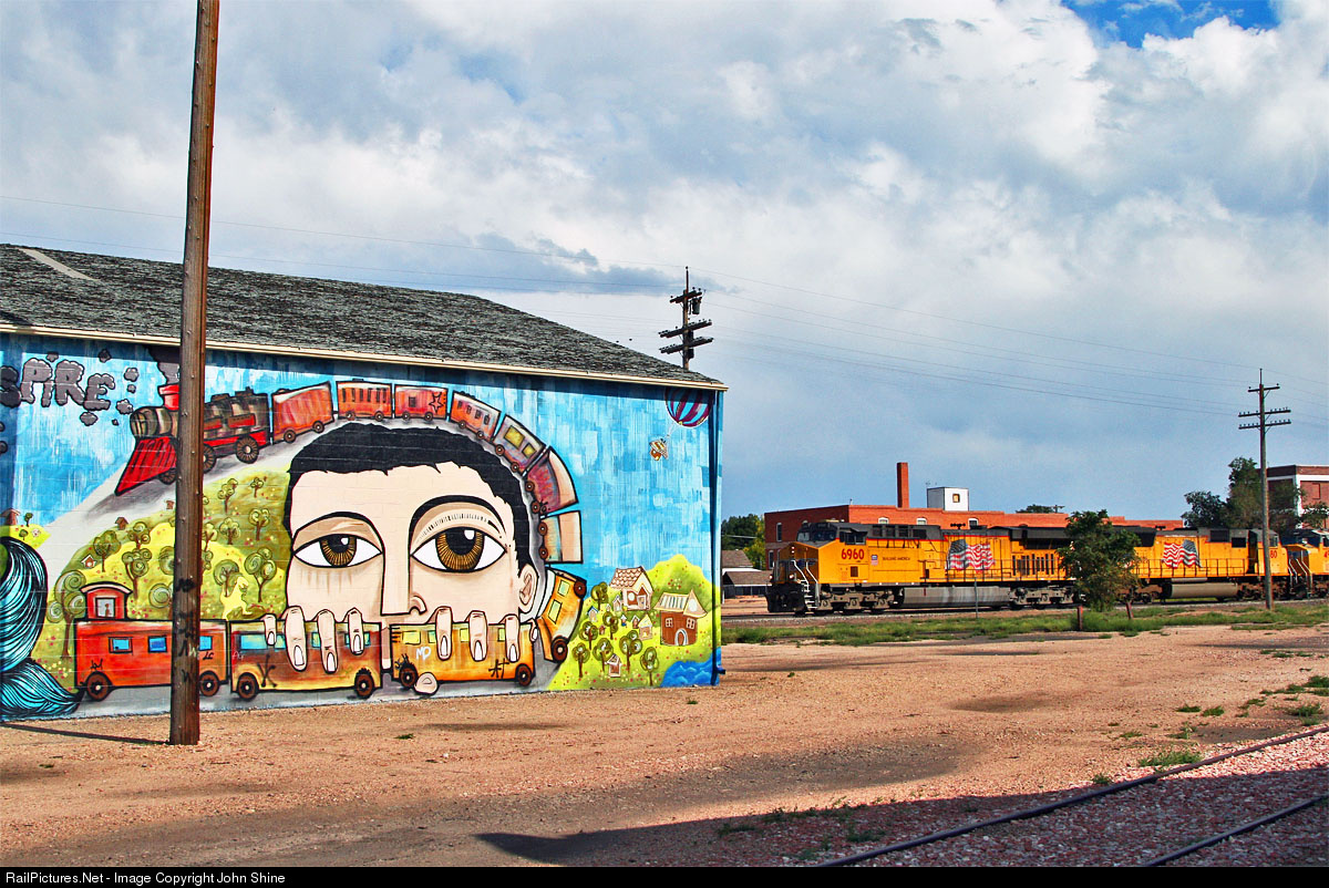 Union Pacific 6960 heads North past this mural in downtown Greeley.