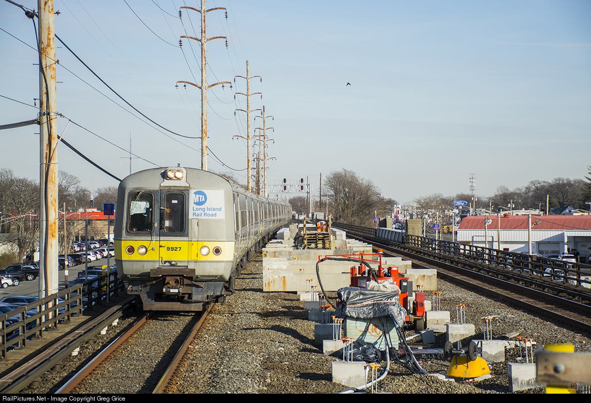 | "Wantagh Station Platform Replacement" A westward Long Island Rail Road train heading towards Penn Station passes by the "Phase 1" foundation of the new Wantagh Station platform. Phase 1 includes the eastern half of the platform, while Phase 2 focuses on the western half. The project is set to be completed in 2018. |