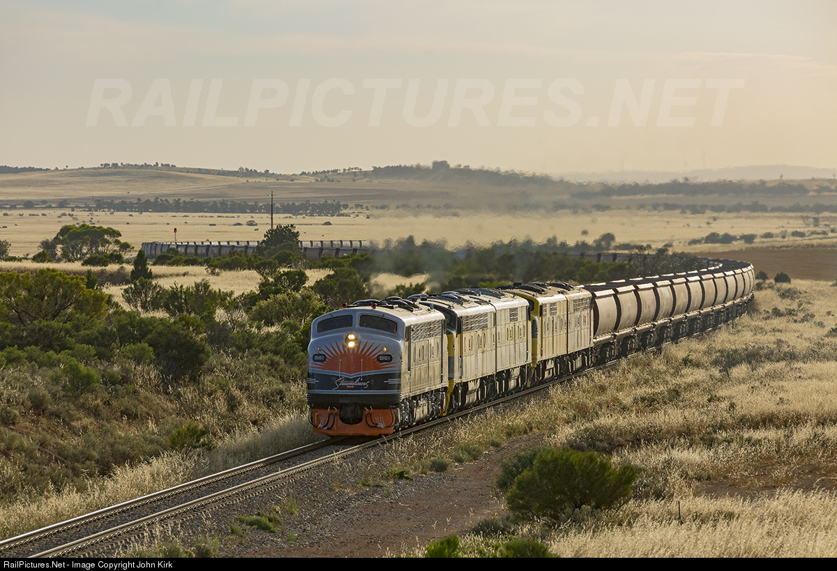 Sixty-five-year-old veteran EMD diesel locomotive B61 in its special Streamliners 2016 livery, leads four other veterans (S317, GM27, GM10, S302) as they work hard up a steep grade with the Southern Shorthaul Railroad coal wagon transfer from the closed power station in Port Augusta, SA to NSW.