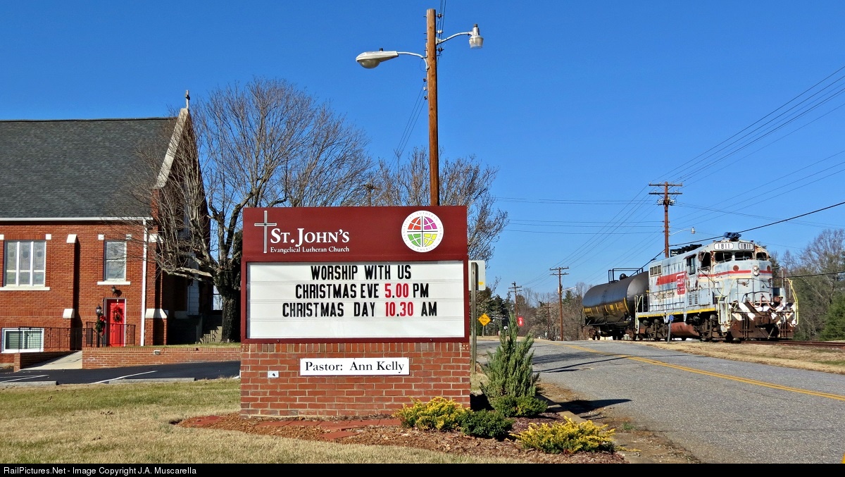 | A line that only sees traffic once or twice a week comes alive as the Caldwell County Railroad classic Family Lines GP16 rolls through Hudson. It is passing St. John's Lutheran Church with a load of just 1 tanker car as they make the short journey back to Hickory. |