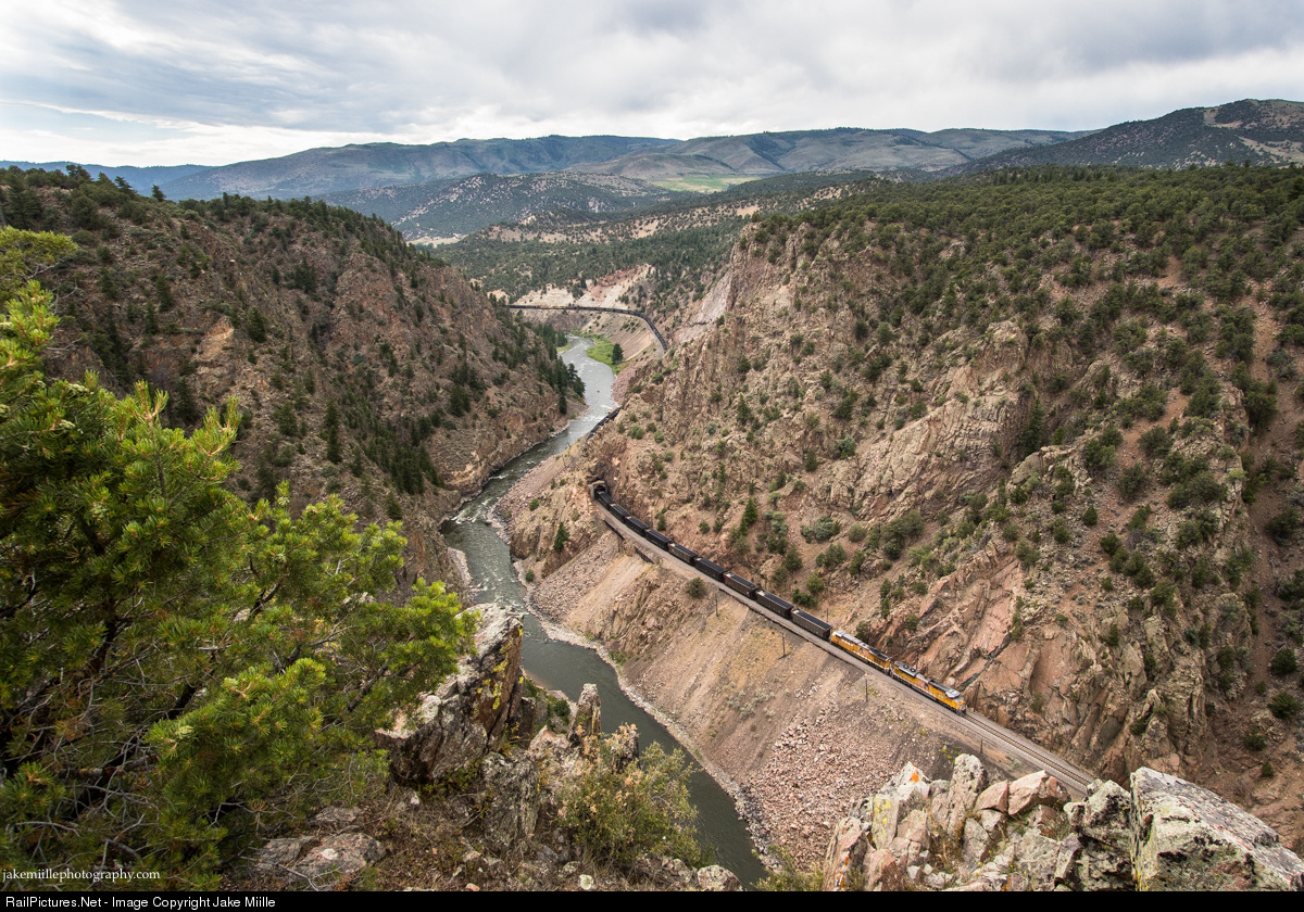 | On a stormy summer afternoon, the sound of a loaded coal train bounces off the walls of Little Gore Canyon. This heavy train is working its way up the Western Slope of the Rocky Mountains. Soon the tracks will flatten out around Kremmling, but that won't be the end of the trek. There is still another 2,000 feet of vertical climb before topping out in the Moffat Tunnel. |