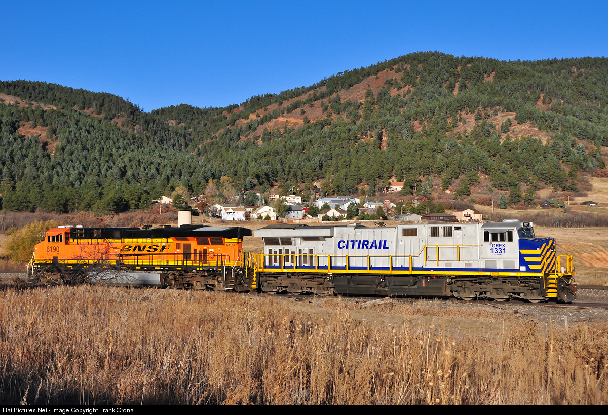 | A Citirail leaser has helper duties this day as it seen with a fellow GEVO on the spur track at Palmer Lake. The silver, blue and yellow paint of the 1331 is a nice change from the constant barrage of BNSF orange seen along this line. |