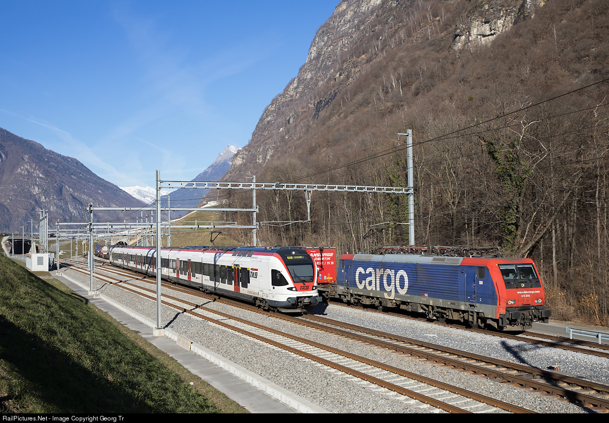 Giustizia is the junction, where the Gotthard Base Tunnel line which is bypassing Biasca, joins the Gotthard Mountain line, about 3 kilometer south from Biasca. Southbound Hupac intermodal train 43075 from Rheinhausen/Germany to Gallarate/Italy (Busto Arsizio Terminal) with locomotive Re 474 # 005 came via Biasca and has to wait for a few minutes. "Flirt" RABe 524 101 of TILO (daugther of SBB and TreNord) is running as Regio Express 4313 from Bellinzona to Erstfeld via the Gotthard Mountain line, heading towards Biasca.