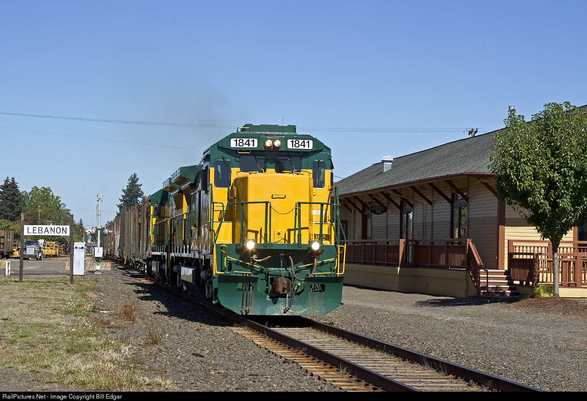 The Albany & Eastern crew gets its train moving through Lebanon at the depot, headed for a log transfer yard in Crabtree, several miles north of Lebanon on former SP trackage. It will set out the empties and pick up loads, returning them to Lebanon for forwarding the next day to Albany, OR.