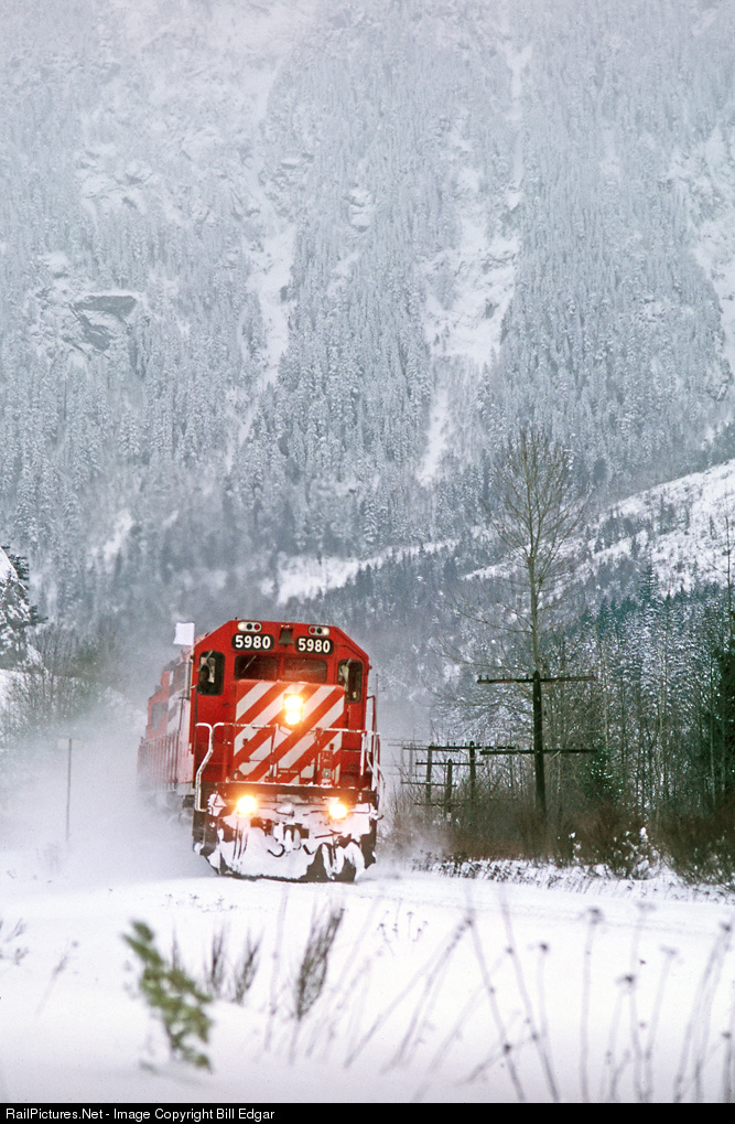 | CP 5980 pays little attention to the blizzard conditions in the lower Fraser River Canyon as it kicks up snow at a crossing in Yale, BC as the freight heads west toward Vancouver, BC. The extra lights are lit, and one flag waves as the train blasts through town. |