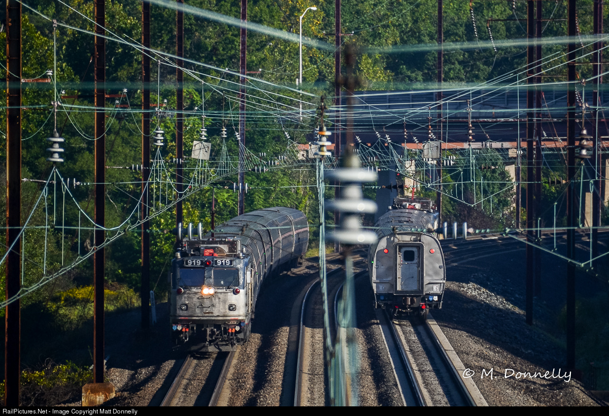| "Hello and goodbye." A Northeast Regional passes the Vermonter, both with AEM-7s. A year later these locomotives would all be retired. |