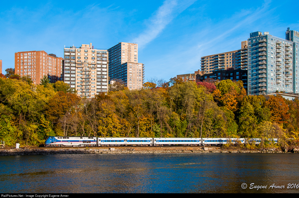 | Fall colour provides the backdrop for a Metro North Hudson Line train from Poughkeepsie, as it runs along the north bank of Spuyten Duyvil Creek, heading towards Grand Central Terminal in Manhattan. |