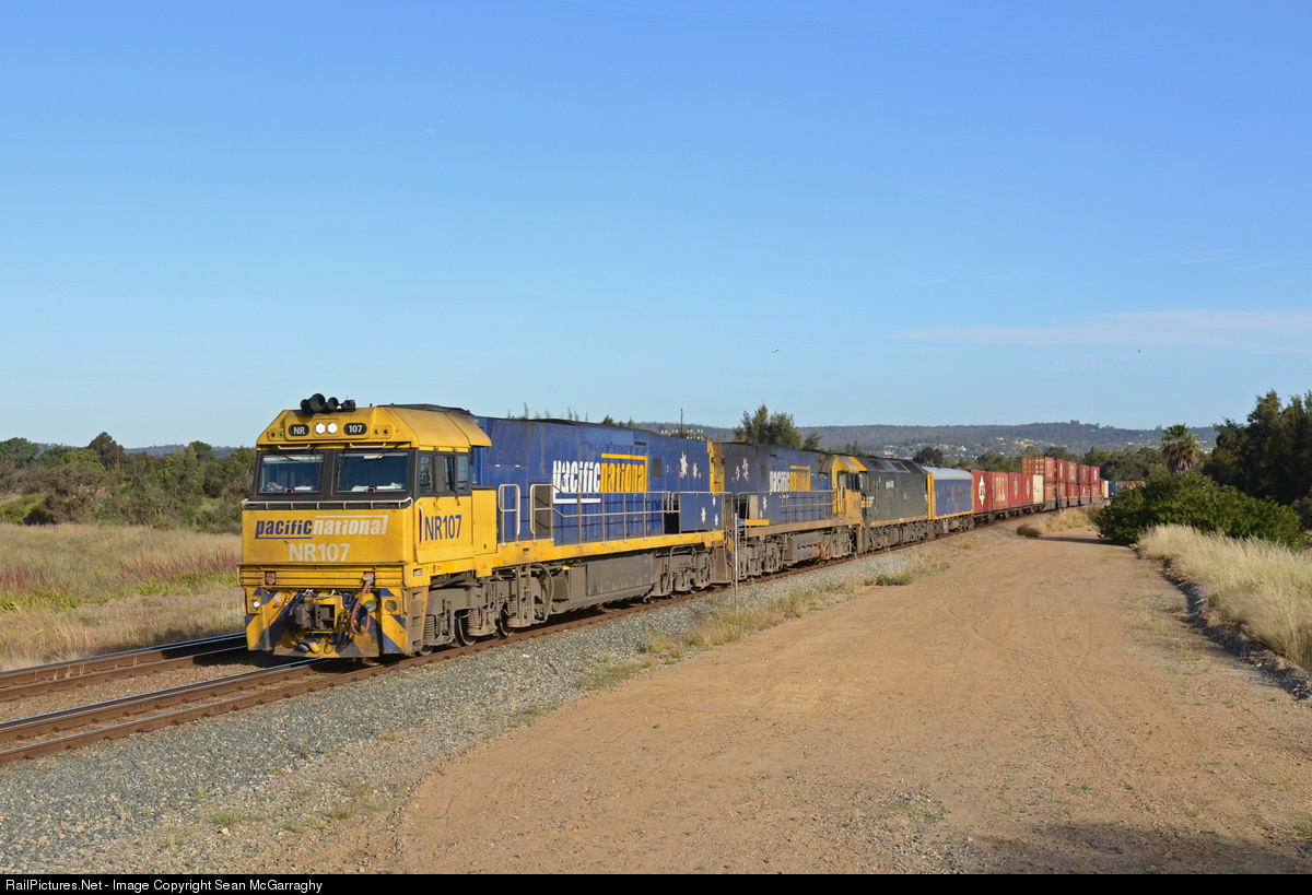 | NR107, NR49 & G538, the latter of which is a very rare visitor to Western Australia haul 3PS6 Perth to Sydney superfreighter through the outer suburb of Stratton. |