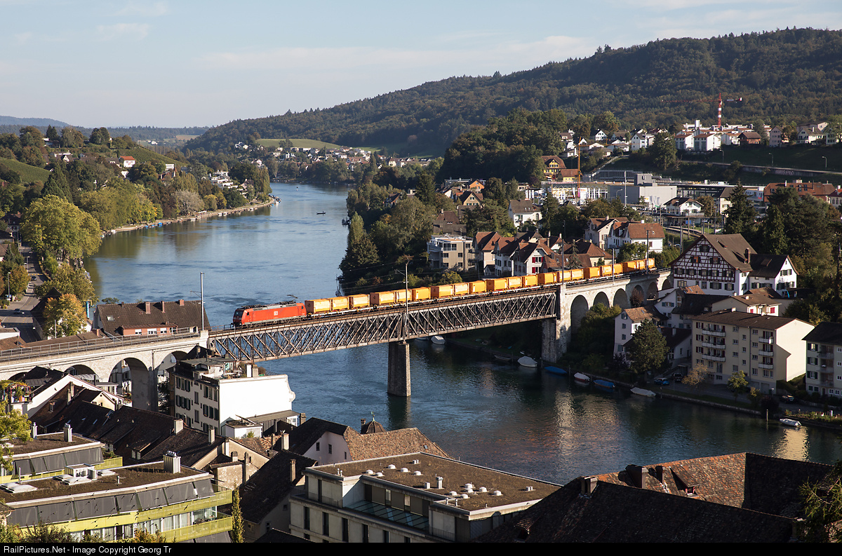 | 185 of the DB AG is crossing the Rhine between Feuerthalen and Schaffhausen. The train is running from Weinfelden via Romanshorn-Kreuzlingen and Schaffhausen to Singen, because the shorter way from Konstanz to Singen is closed for track work. |
