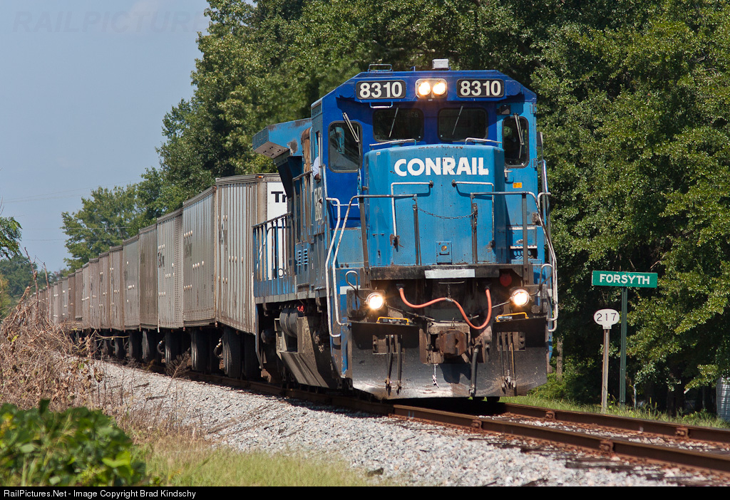 Things in this photo that no longer exist: Roadrailers, (original) Conrail Paint, NS C40-8s, jointed rail on the Griffin District. The milepost and station sign are all that is unchanged today.