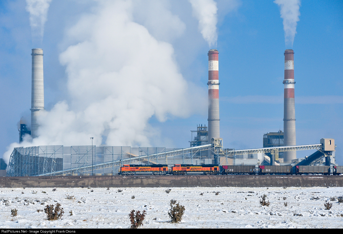 | A pair of Aces keep moving at a constant slow speed as they unload their low sulfur coal at the Xcel Energy Comanche plant which happens to be the largest coal-fired power producing station in Colorado. The plant’s original two generating units were built in 1971 and 1973 respectively and are distinguishable with their red and white painted stacks. The most recent station, seen on the left, was built after the turn of the century and came online in July of 2010 giving this plant the capacity of producing 1410 Gross Megawatts. Between the old and new stacks is the latest addition to the plant, a 100 foot tall HDG (hot-dip galvanizing) Coal Pile Wind Fence that is used to keep coal dust from escaping the facility. |