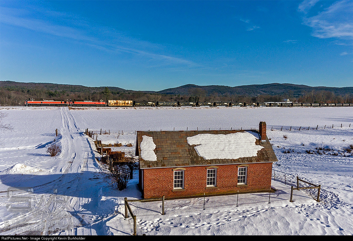 On Friday, December 23, Providence & Worcester's pair of ex-FEC SD70M-2s - 4302 and 4301 - lead a 99-car empty ethanol train northbound toward the VRS connection in Bellows Falls, VT and past an old brick schoolhouse along the New England Central Railroad's Palmer Subdivision.