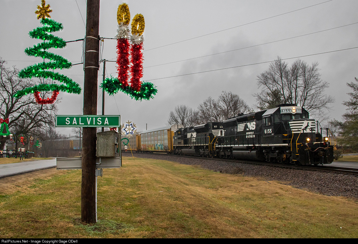 | NS 275 rolls by the Christmas wonderland in Salvisa with a veteran SD40-2 leading the over 8000 foot rack train. NS 275 would tie down in Danville Yard for the Christmas holiday shutdown. |