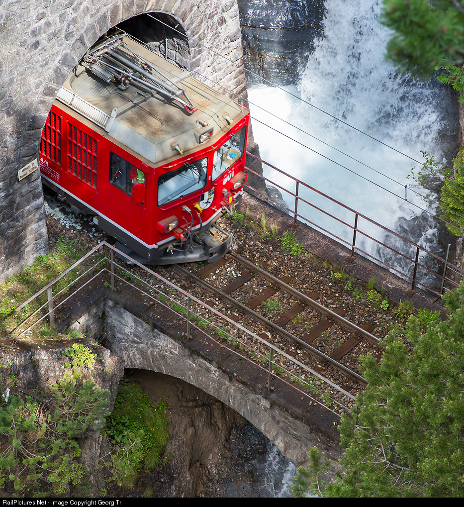 Dual system locomotive Gem 4/4 # 801 of the RhB, usually in service on the Bernina line, on a driver training run between Filisur and Davos, in the short Bärentritt gap between Brombenz II and Bärentritt tunnel.