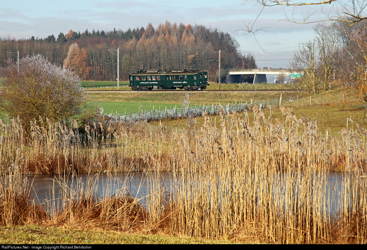 Some frost of the last night is still visible, when the historic railcar Be 3/4 N°43 of the former Bodensee-Toggenburg-Bahn is en route on the line Winterthur – Schaffhausen.