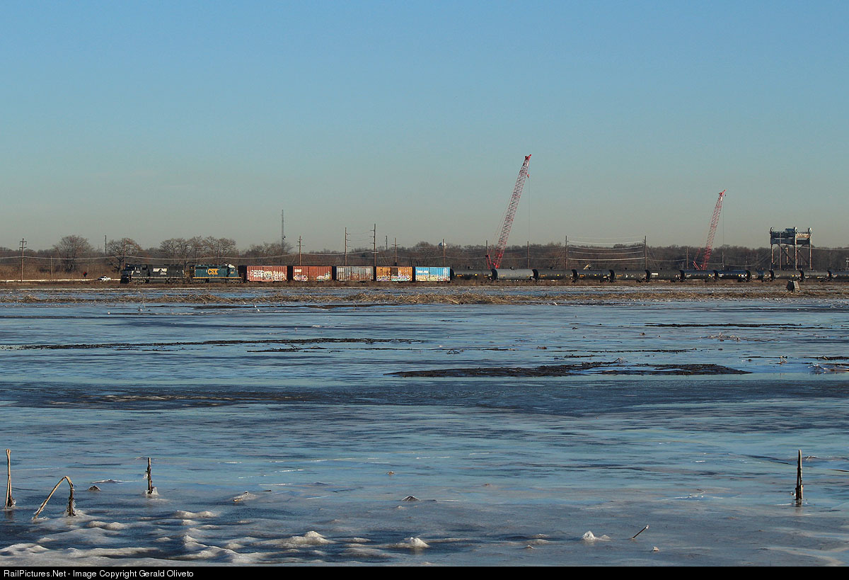 | Conrail freight CA-11 races across the frozen mudflats of the Raccoon Creek with an NS SD60E leading the way. The cranes in the background are part of highway construction to replace the 1940 US-130 lift bridge (pictured at the rear right of frame) with a high span, fixed structure. |