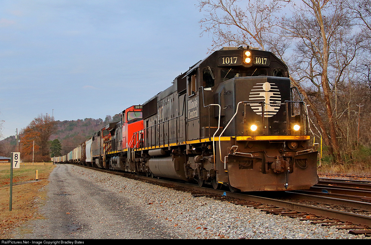 | Norfolk Southern Grain Train 42A is seen here stopped in Attalla, AL. Waiting for a Train ahead of them to get out of the way where they can continue South for Mobile, AL. with IC SD70 #1017 leading CN C44-9W #2611 & BCOL C40-8M #4617. No doubt a rare locomotive lashup |