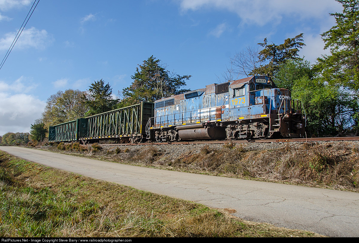 | Hartwell 1973 (ex-Conrail 7874) takes two empty centerbeam cars north from Royston. At Bowersville it will supposedly join another unit and a string of covered hoppers to make the road freight to Toccoa. Alas, on this day a customer was late unloading a car and the train to Toccoa never materialized. |