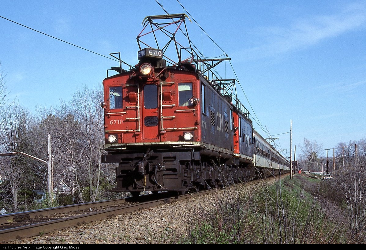 CN 6710 makes a stop in suburban Montreal in May of 1988. I really like these old boxcabs.