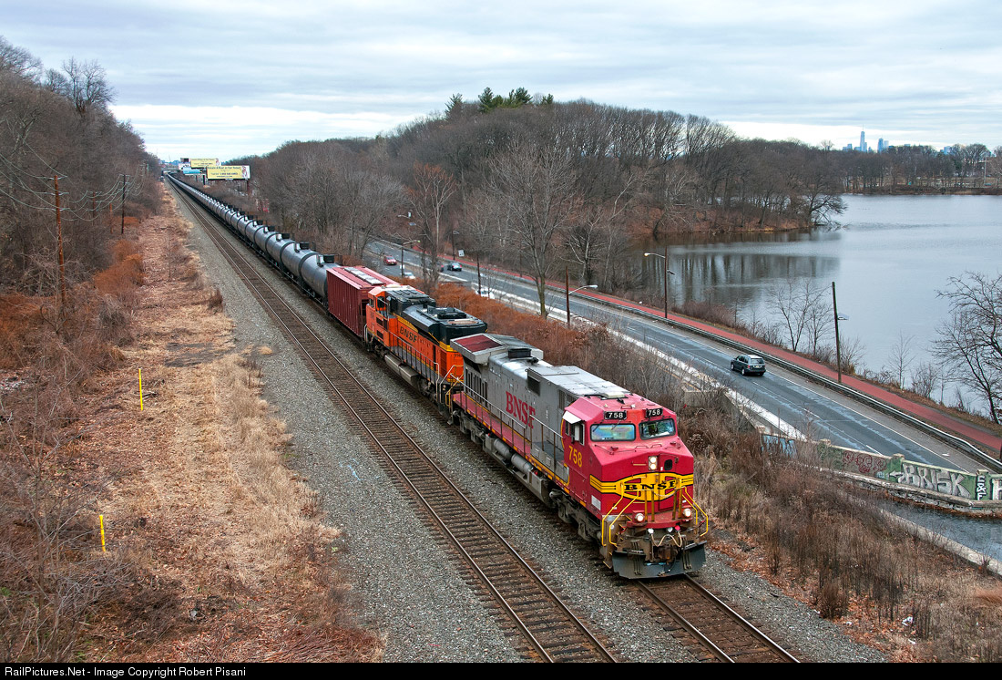 A BNSF warbonnet C44-9W leads CSX K142 past Newark's Weequahic Park. The loaded crude oil train is westbound on Conrail's Lehigh Line headed for Philadelphia, PA.