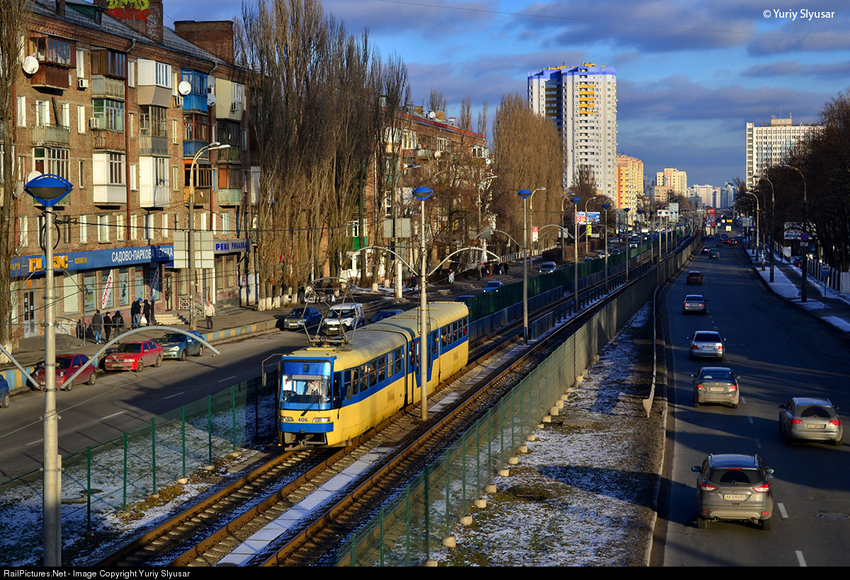 | Tramway KT3UA #406 leading on speed tramway route #3 (Starovokzal'na Street - Kil'tseva Doroga) on Prospect Kosmonavta Komarova. This tramway was rebuilt from two tramways Tatra T3SU #5532 and #5538 in September 2009. This tramway as all tramways, trolleybuses and buses was property of municypal company "Kyivpastrans" (Kyiv passenger tramsport). |