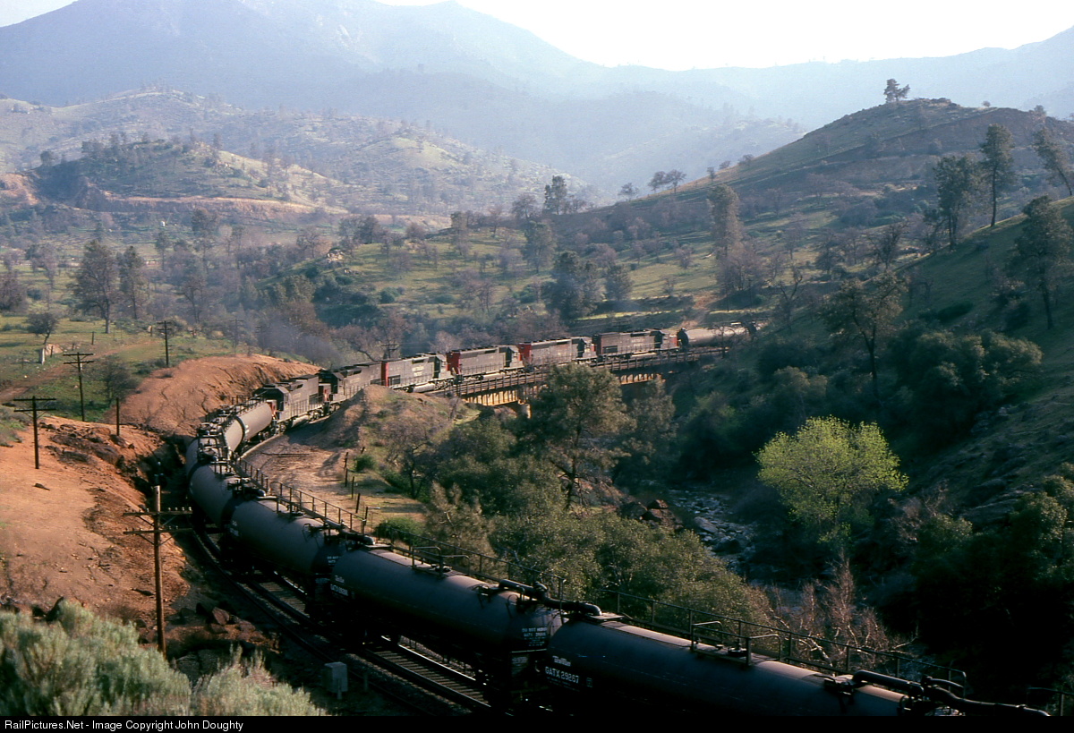 Four tunnel motors and two SD-45s are in run 8 and they grind uphill over the bridge just below Tehachapi Loop. The Oil Cans train usually required at least 4 units on the point, with 5 to 6 units as helpers. It was one of my favorite trains to photograph and chase on Tehachapi Pass, and with so many locomotives needed to get the train up the hill, it could be heard from miles away.
