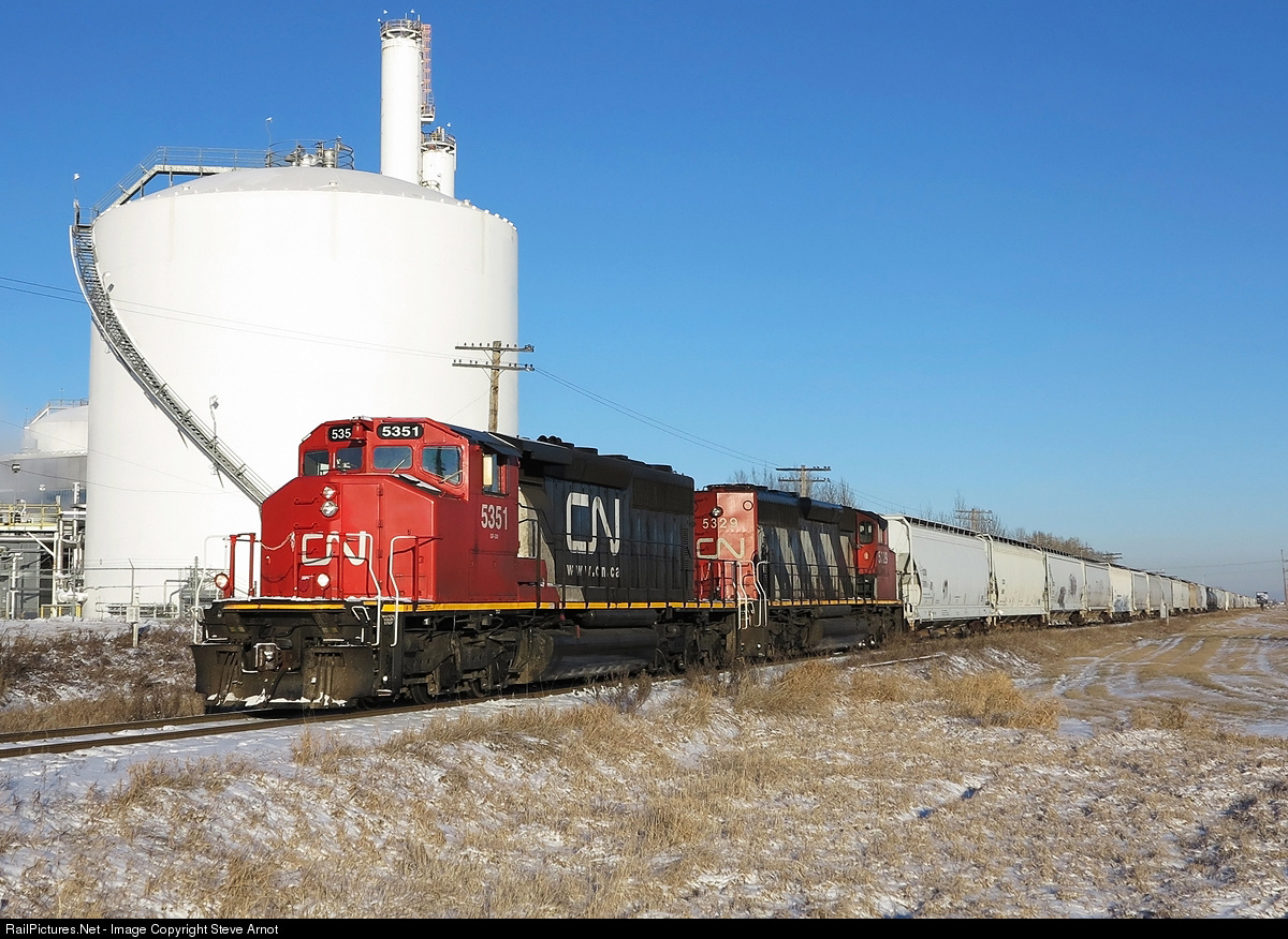 SD40-2(W)s 5351 and 5329 pass Praxair’s Fort Saskatchewan plant as they head west on the Fort Saskatchewan Industrial Lead with cars bound for Dow Chemicals.