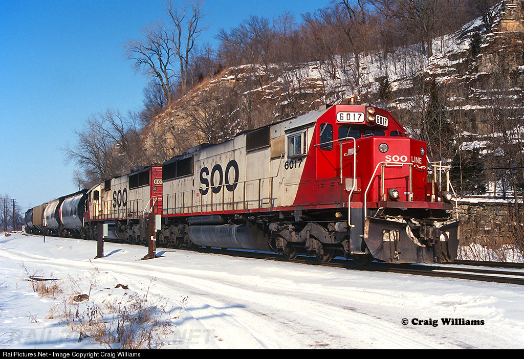 | Run thru Soo/CP power is seen here on a loaded potash train as it makes it way east on the BN. The train is about to pass thru East Dubuque as it makes it way from LaCrosse east. Was somewhat common to get run thru power on these potash train to the BN. Think most of these trains came from the CP at Duluth or St. Paul? The 1st batch of Soo SD60's, 21 units (6000-6020), were delivered between between August and October 1987. |