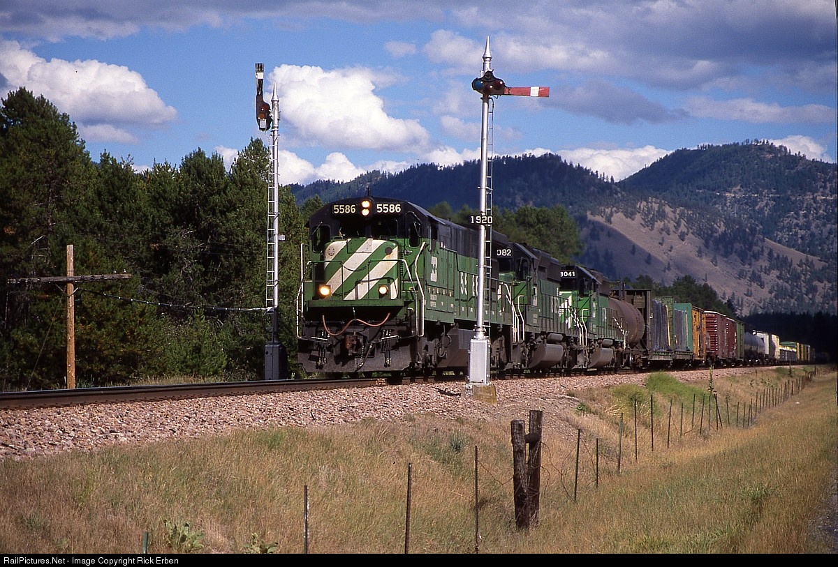 The 1990s were a great time to be out trackside. There were still plenty of locomotives in AT&SF, C&NW, D&RGW and SP colors, rolling stock still bore the road names of myriad lines and traffic was burgeoning. Indeed, some routes even retained the nostalgic remnants of early 20th century signaling, as evidenced by the NP-era semaphores that populated Montana Rail Link's route along the Clark Fork west of Missoula. Here BN 5586 leads a westbound manifest through the tranquil valley between Spring Gulch and St. Regis, MT on a September morn. Fuji Astia.