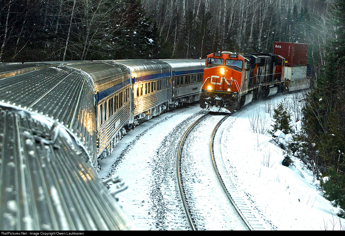 | Viewed from the dome atop the Kootenay Park, CN ES44DC 2258's headlights gleam on stainless steel as it leads an eastbound intermodal train past VIA's train number one, the westbound "Canadian." |