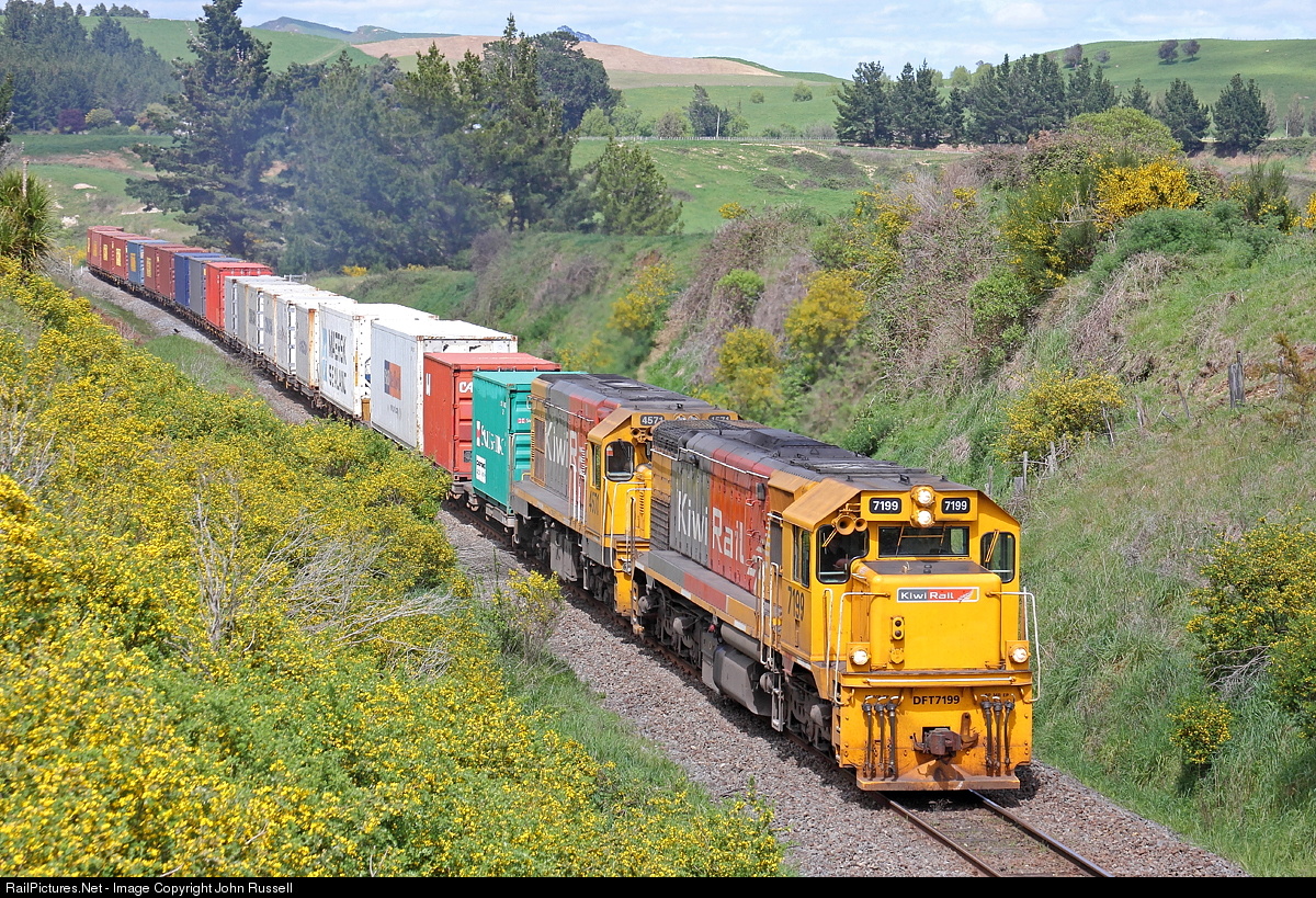 Trains on 3' 6" (1.067m) track from Whangarei to Bluff with virtually heritage rebuilt EMD and GE locomotives still the mainstay power. The network was privatized in 1990's and operated by Toll until 2008 when state owned KiwiRail was established.