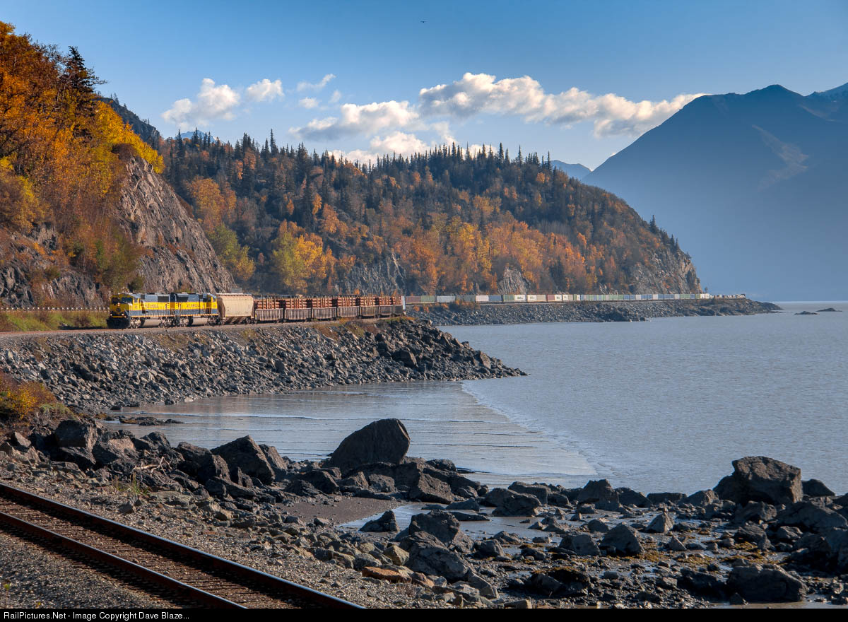 | Back when the days were longer and the hillsides were more colorful I caught a mixed freight of UP/BNSF interchange and COFC coming north from a connection with the AML Barge in Whittier. The train is rounding Beluga Point and snaking along the shore of Turnagain Arm enroute to Anchorage. |