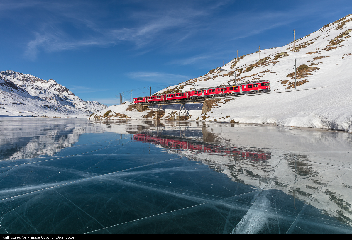 Along the frozen "Lago Bianco", the electric railcars ABe 4/4 #55 "Diavolezza" and ABe 4/4 #54 "Hakone" are pulling a short regional train bound for Tirano. Black Ice on the "Lago Bianco" is a rare natural phenomenon; the frozen lake "Lago Bianco" was the largest ice field in Switzerland during the whole month of December 2016!