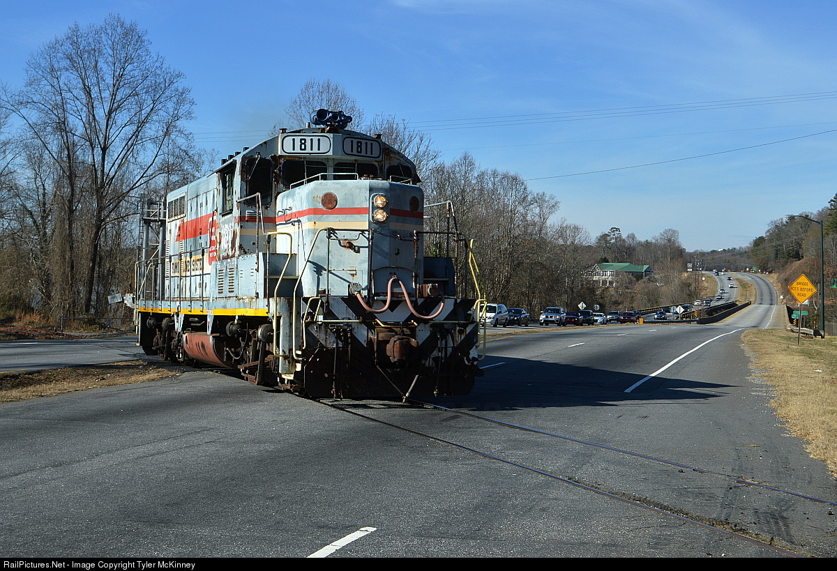 One of the Caldwell's antique GP16 rebuilds, still in Family Lines paint and running light, crosses US321 in Hickory on the way back to the company yard.